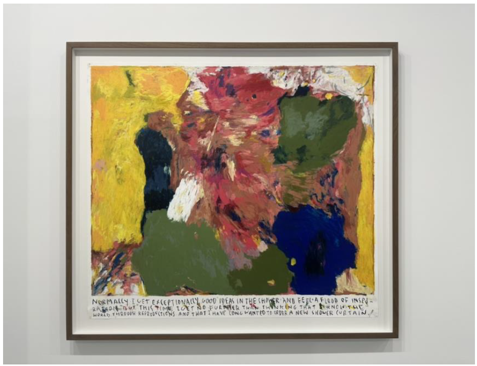 Abbildung 1: Van de Velde, Rinus (2024): Normally I get exceptionally good ideas in the shower … . 163 x 184,5 cm. Ölpastel auf Papier. In: Galerie Max Hetzler. Foto: Karl-Josef Pazzini. Bildtext: „Normally I get exceptionally good ideas in the shower and feel a flood of inspiration, but this time I get no further than thinking that I know the World through reproductions and that I have long wanted to order a new shower curtain.“.